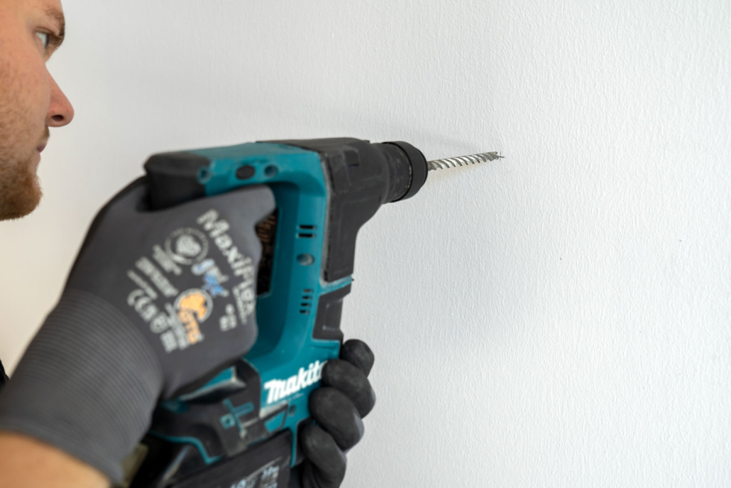 4. Nun bohren Sie an allen markierten Stellen einen Befestigungsdübel an die Wand. Achten Sie darauf, dass der Dübel zur Wand passt.