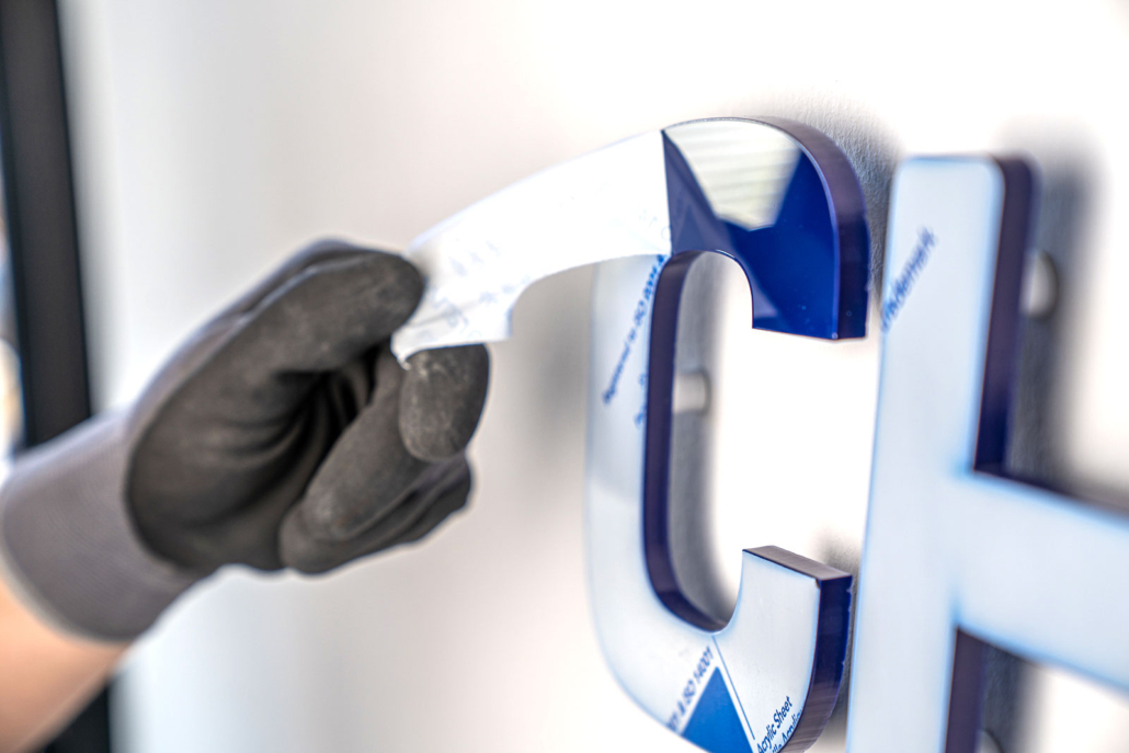 Ein großer Vorteil dieser Montageoption ist, dass das Logo wieder abgenommen und an anderer Stelle angebracht werden kann. Zum Beispiel weil Sie in neue Räumlichkeiten ziehen. Durch die Clickfix-Halterungen sind die einzelnen Buchstaben durch einen kleinen Ruck wieder leicht von der Wand zu nehmen. Heben Sie einfach die Bohrschablone auf.