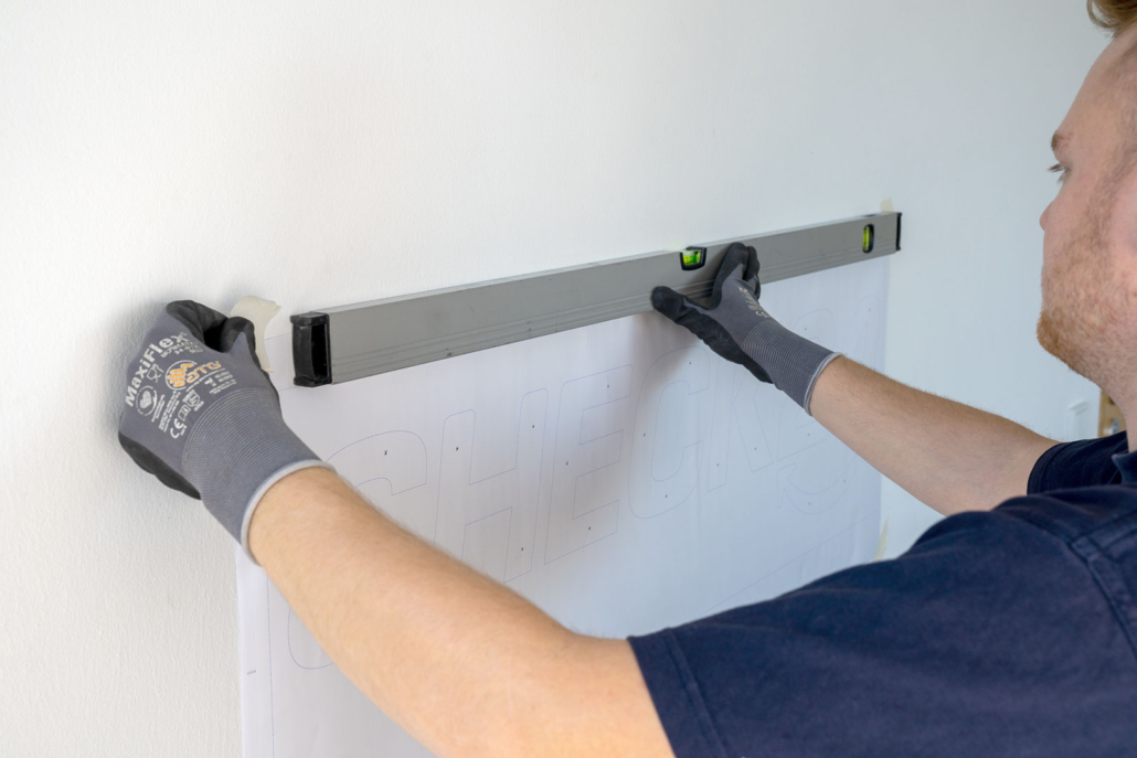1. Befestigen Sie den mitgelieferten Papierausdruck Ihres Logos im Maßstab 1:1 genau an der Stelle der Wand, an der das Logo später sein soll. Sie benötigen dafür das Klebeband, die Wasserwaage und den Meterstab. Achten Sie auf eine gute Befestigung. Es ist wichtig, dass die Schablone nicht verrutscht.