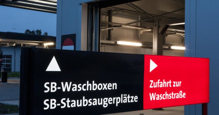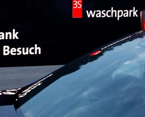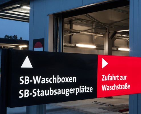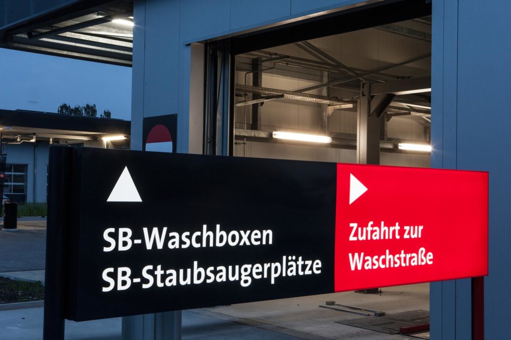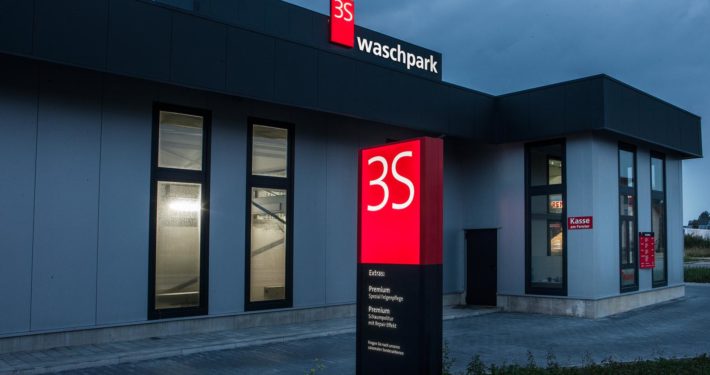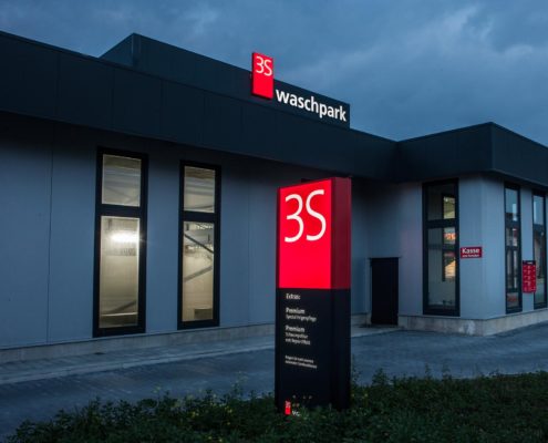 Beim 3S Waschpark sind einige LED Leuchtwerbanlagen zu sehen; wir lieferten 4 freistehende Pylone, 4 LED Leuchtkästen, Fassadenbuchstaben und einige kleinere Hinweisschilder.