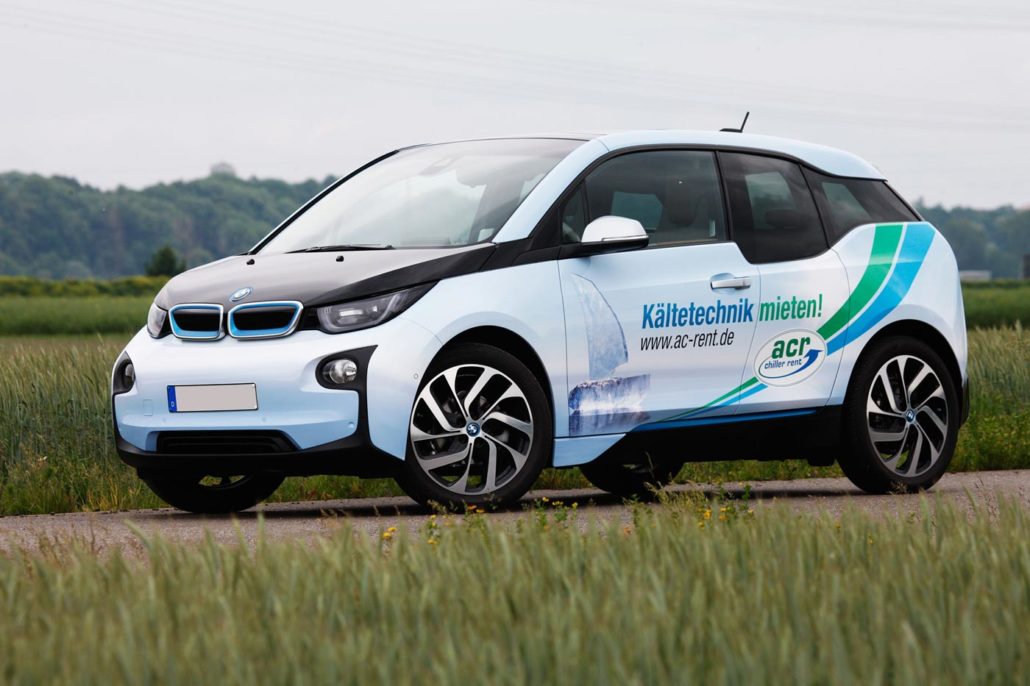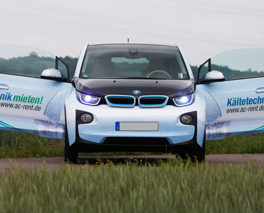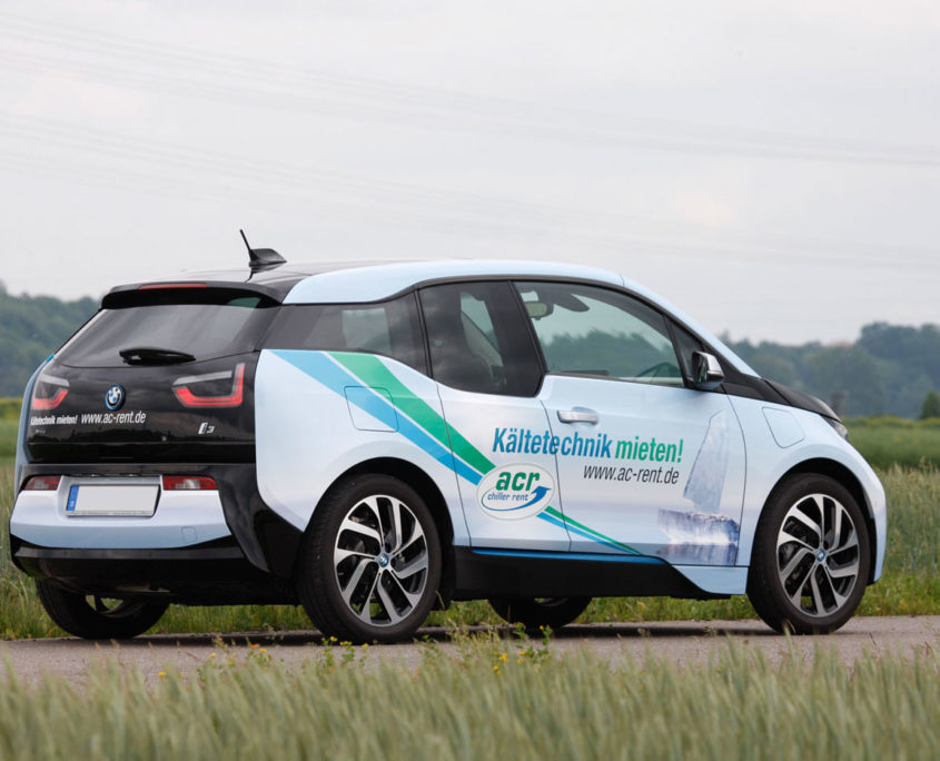 Der I3 ist ein modernes Auto welcher besonders gut mit einer modernen Beschriftung zur Geltung kommt. Beim I3 für die Firma ACR Kältetechnik aus München überzogen wir die gesamte Karosserie mit einem individuellem Werbedruck. Diese Technik nennt sich Vollverklebung.
