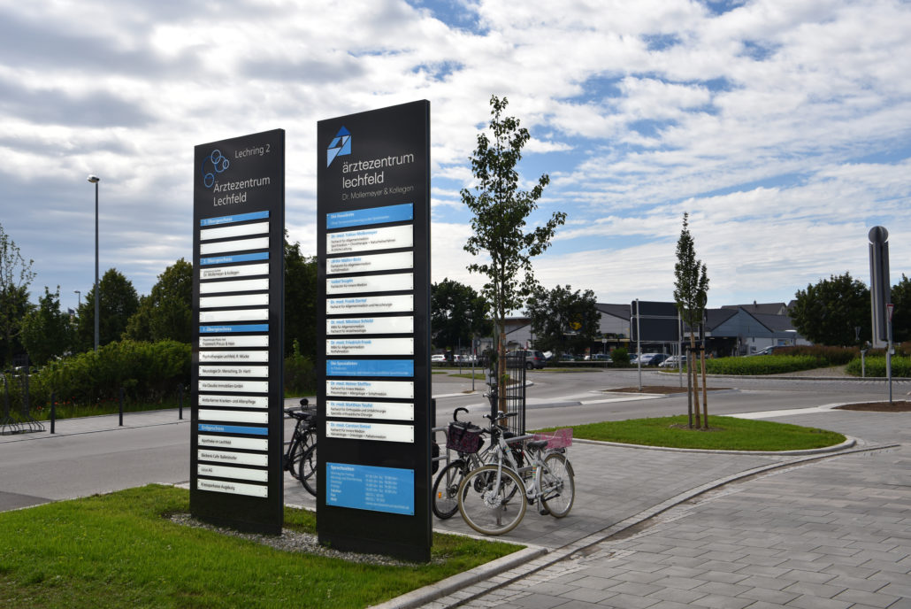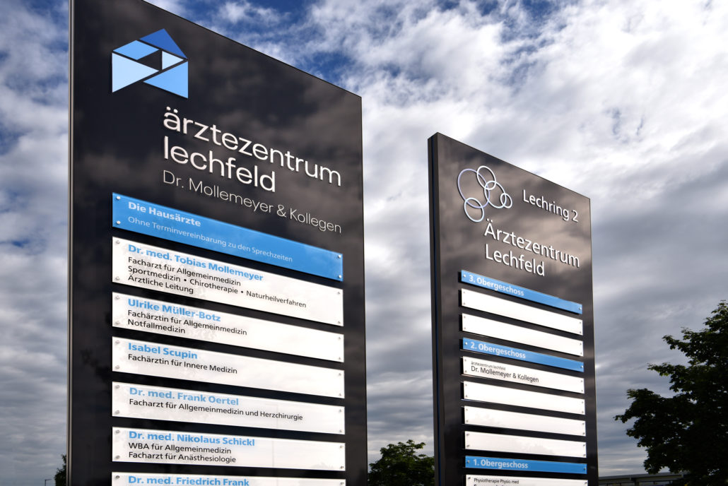 Eine weitere Möglichkeit stellen Pylone (oder auch Stele) genannt dar. Diese Bauart bietet sich an, wenn die Beschilderung nicht am Gebäude befestigt werden soll, sondern freistehend – z.B. vor dem Gebäude, an einem Parkplatz – montiert werden soll.