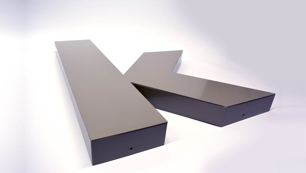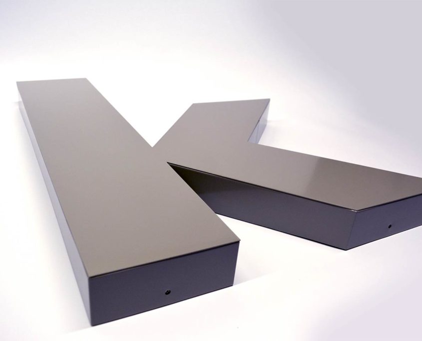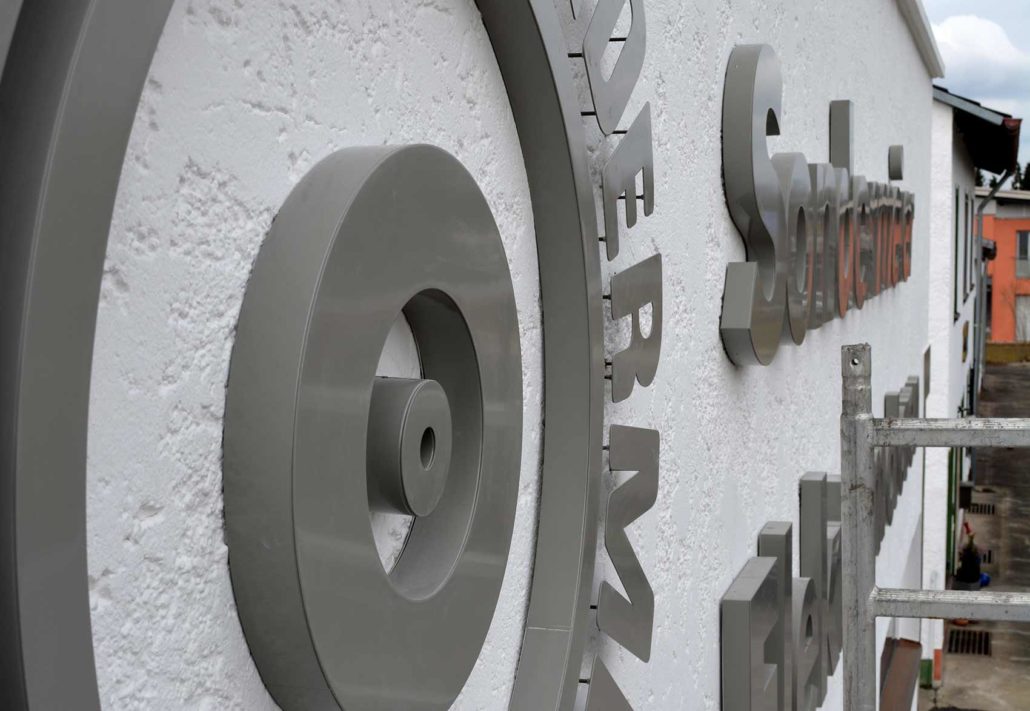 Nachdem die Gestaltung und Umsetzung geklärt war, ging es an die Herstellung. Wir verwenden ausschließlich Aluminium für die Fassadenbeschriftung, da Aluminium witterungsbeständig ist. Die Buchstaben wurden mittels Pulverbeschichtung nach Kundenwunsch farbig lackiert.