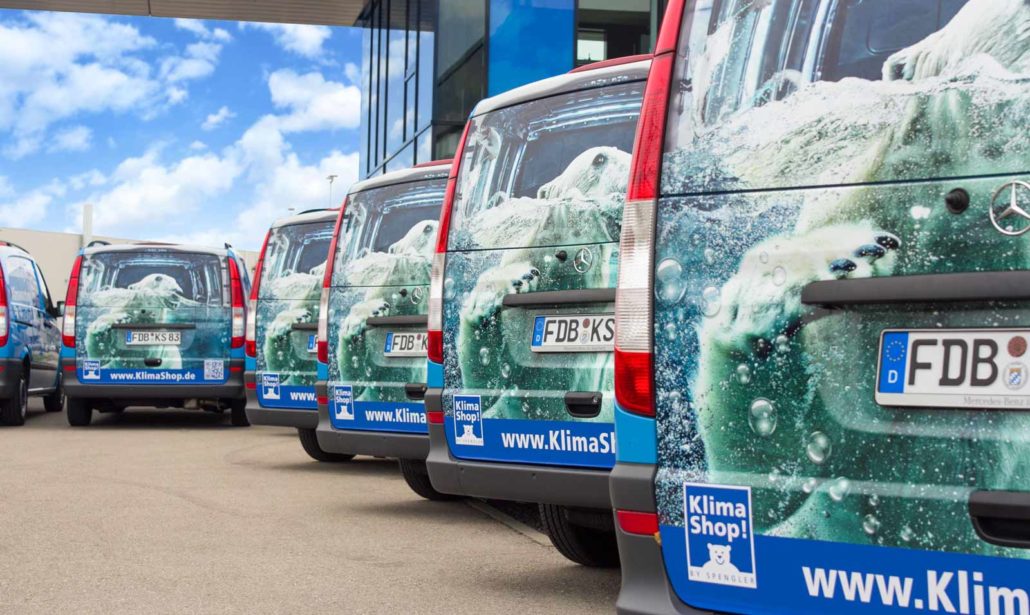 Bei den Autobeschriftungen der Firma KlimaShop! sollte ein schwimmender Bär in der Ladezone umgesetzt werden. Hierzu nahmen wir genau Maß um den Druck exakt passend für die Heckfläche der Fahrzeuge zu erstellen.