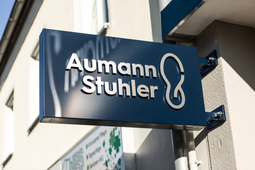 Für die Orthopädie Aumann und Stuhler montierten wir sowohl die Leuchtschrift wie auch die sonstigen Werbeanwendungen. Die Leuchtschrift sollte besonders filigran ausgeführt werden und trotzdem auffallend leuchten, hierfür eignen sich unserer Acryl LED Buchstaben ideal. Sie wurden auf einer Montagekonstruktion vormontiert und verkabelt. Die Leuchtschrift konnte dank der individuell gefertigten Unterkonstruktion einfach auf dem Vordach befestigt werden.