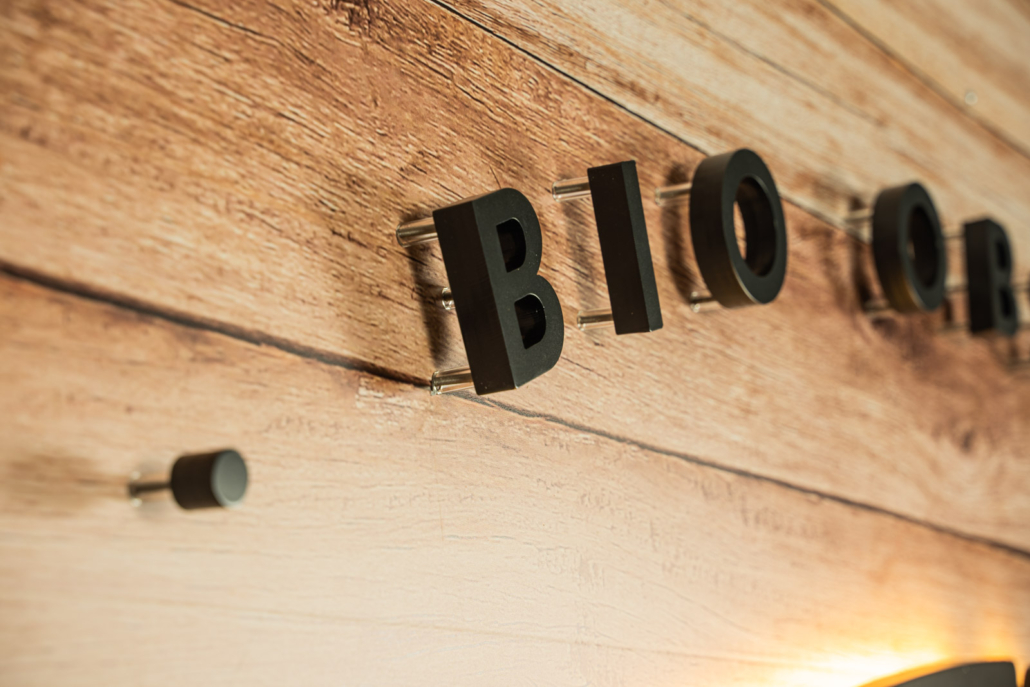 Deswegen haben wir das Logo mit Acryl LED B Buchstaben und aufgesetzten Lettern aus gebürstetem Kupfer umgesetzt. Die LEDs wählten wir in 3000K warmweiß. In der Kombination mit dem Kupfer entsteht so ein einladendes, fast gold schimmerndes Licht. Die rückseitigen Acrylbuchstaben fertigten wir aus 10mm starkem, opal weißem Acrylglas, damit die Schrift auch bei Tageslicht leuchtend zu sehen ist.