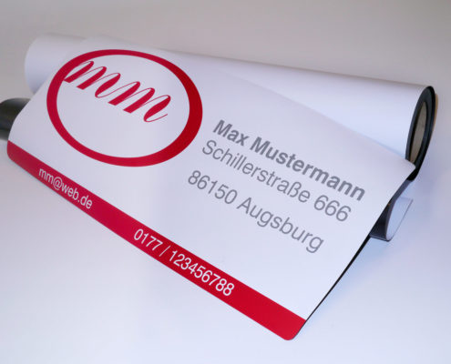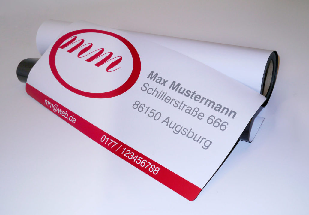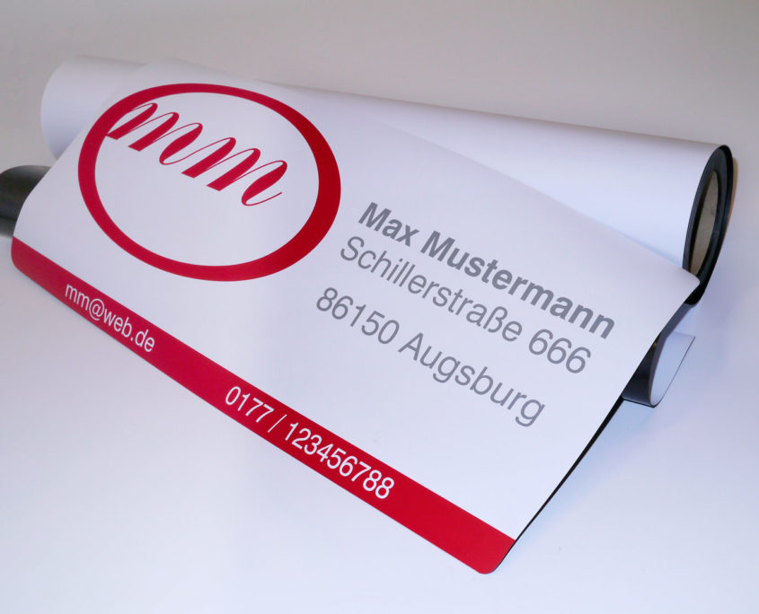 Die sichtbare Oberfläche ist in weiß gehalten, die Rückseite besteht aus einer magnetisch gummierten Schicht, die mit Hilfe eines Schutzlackes versiegelt ist. Es handelt sich praktischerweise um ein flexibles Material, das sich leichten Wölbungen und somit auch der Fahrzeugkontur anpasst. Durch die Verwendung der Magnetkraft benötigen Sie einen eisenhaltigen Untergrund, der nicht nur bei Fahrzeugen, sondern auch im Innenbereich zum Beispiel bei Metalltüren zu finden ist. Hierfür produzieren wir Magnetschilder, um auf einen laufenden Betrieb oder eine stattfindende Besprechung aufmerksam zu machen.