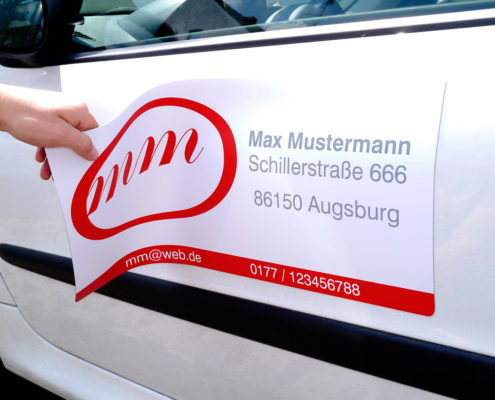 Magnetschilder werden meist als Fahrzeugwerbung verwendet, indem man sie links und rechts auf den Türen mittels Magnetkraft anhaftet. Die standardmäßig viereckigen Schilder eignen sich gut um den Firmennamen, die Kontaktdaten und die Leistung einer Firma zu platzieren. Die Standardgröße für ein Magnetschild auf den Seitentüren beläuft sich auf 60×40 cm. Zusätzlich ist es möglich, neben den viereckigen Flächen, auch formgestanzte Magnetschilder und somit individuelle und auf das Design abgestimmte Konturen anzufertigen. Dadurch erhält das Magnetschild mehr Charme. Durch die Magnethaftung ist das Schild sehr leicht entfernbar und kann dadurch für verschiedene oder nur teils geschäftlich genutzte Fahrzeuge verwendet werden.
