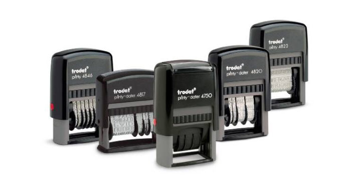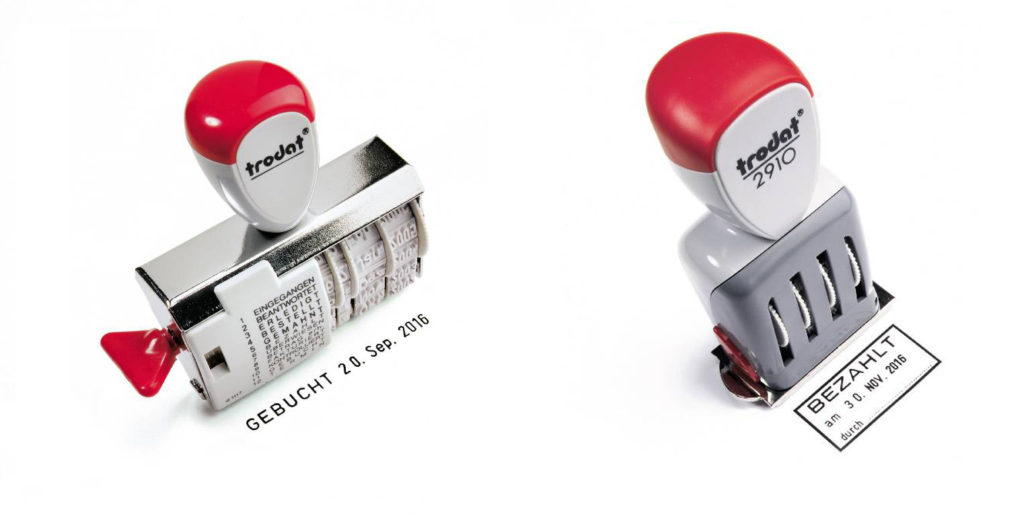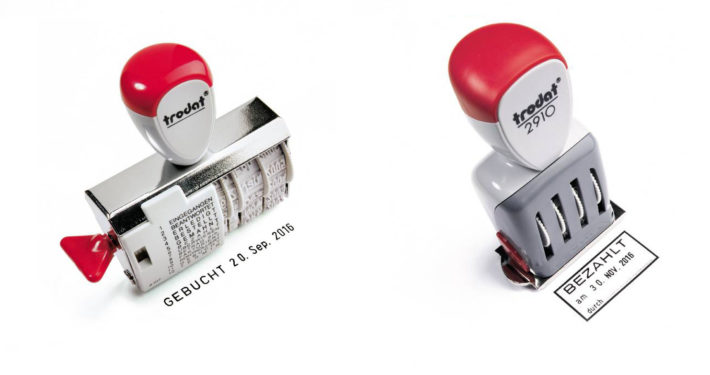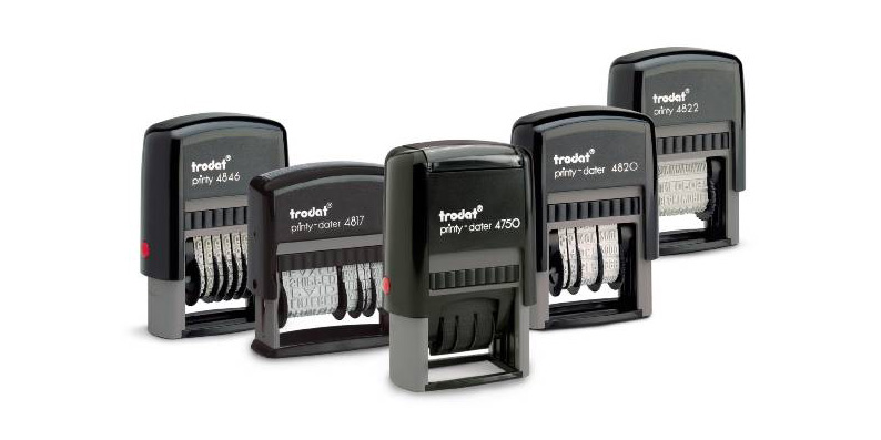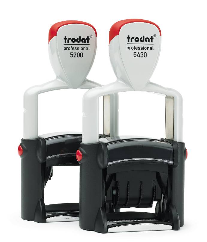 Wir führen die breit gefächerte Produktpalette aller Trodat Stempel. Sie beginnt mit der Professional Serie, welche mit einem ergonomischen Handgriff ausgestattet und in der Mechanik mit Metall verstärkt ist. Der Professional wird häufig in Büros eingesetzt und ist unsere Empfehlung für bis zu 100 Stempelungen am Tag. Dieser Trodat Stempel heißt nicht nur Professional, er ist auch professionell! Der Trodat Printy ist ein kompakter Stempel mit einem Kunststoffgehäuse. Er wird bei geringem Stempelaufkommen verwendet, wie zum Beispiel im privaten Gebrauch. Beide Stempelapparate sind in vielen verschiedenen Größen erhältlich und optional mit einstellbarem Datumsabdruck. Zusätzlich zu diesen beiden Apparaten bieten wir auch die Ersatzkissen, Nachtränkfarbe und die handlichen Trodat Datumsstempel.