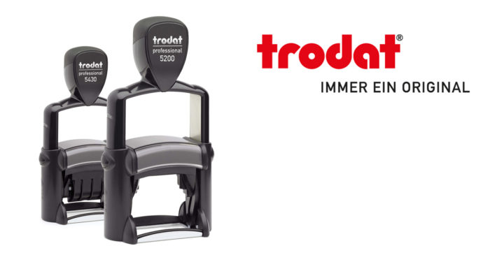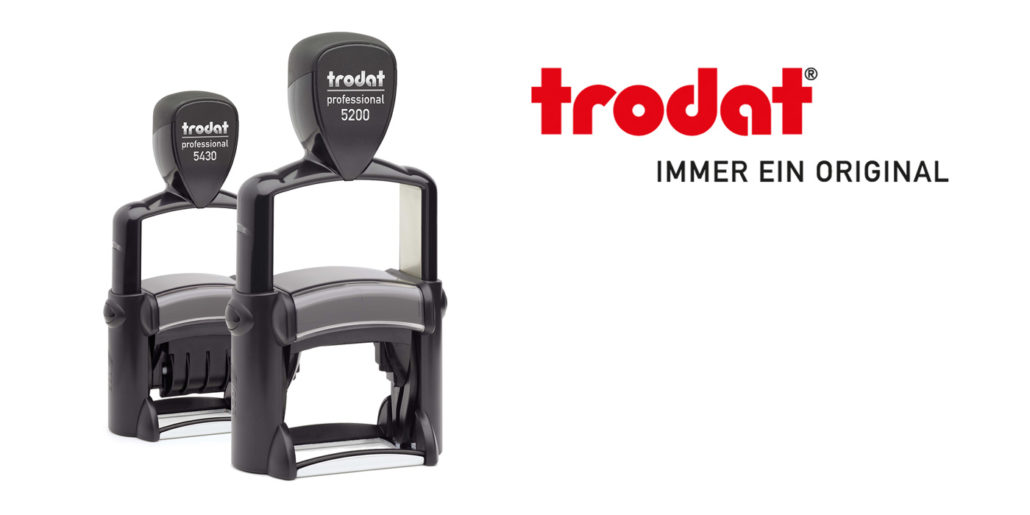 Wir führen die Stempelapparate der Firma Trodat und produzieren mittels der Lasertechnik die dazugehörigen Gummitextplatten. Die Trodat Stempel sind seid jeher bekannt für ihre hohe Material- und Mechanikqualität. Sie sind oft Jahrzehnte im Einsatz und überzeugen durch ihre hochwertige Verarbeitung. Der Vorteil von Trodat Stempeln gegenüber Holzstempeln ist ihr eingebautes Stempelkissen. Sie sind dadurch platzsparend, immer einsatzbereit und sauber.